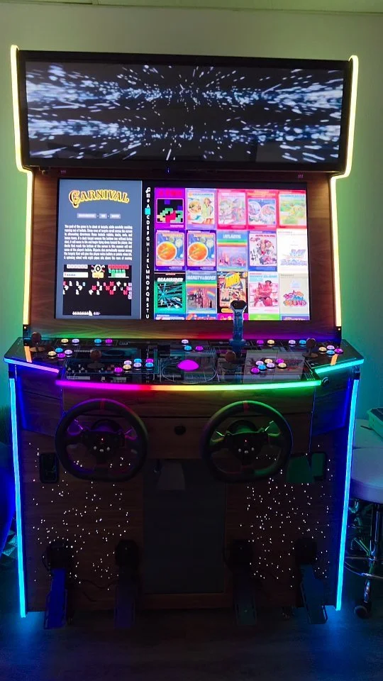 We specialize in custom built arcade cabinets loaded with EXCLUSIVE FEATURES: RGB LED buttons, LCD marquee, back-lit control panel, video kickpanel, 360° racing wheels w/ authentic arcade pedals, CRT shaders, advanced light guns, all plywood construction and more.