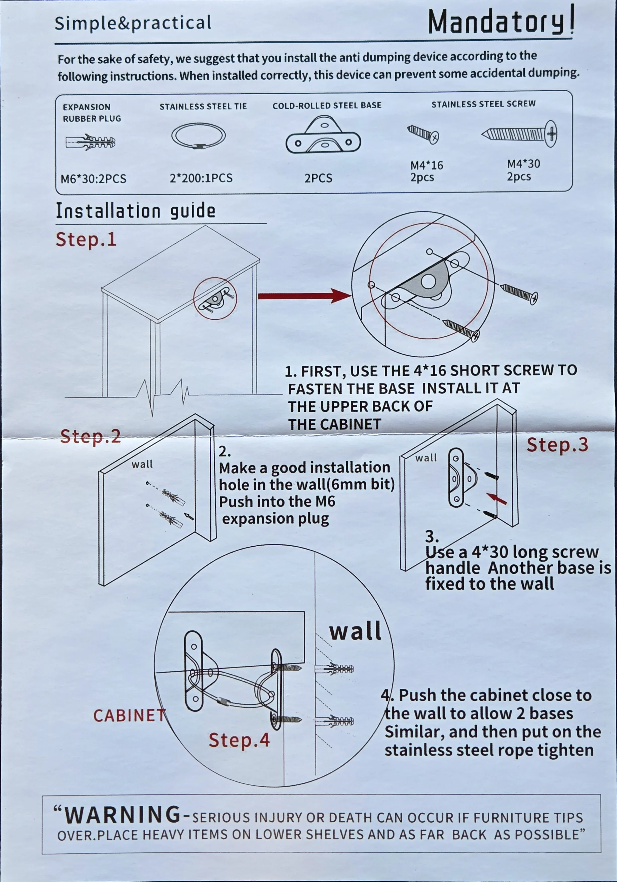 Please mount the included anti-tip hardware to the wall behind your cabinet. This is a mandatory safety feature: